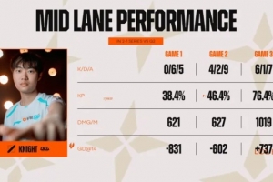 体育资讯3月23日讯 英文流分享一组数据,前三局比赛中knight在前两局前14分钟经济分别落后831和602,仅第三局前期领先。